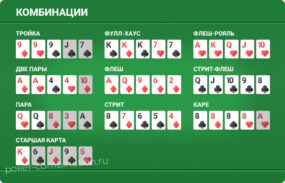 Каждый получает две закрытые карты. На столе появляются пять общих. Из семи выбирают пять лучших. Вот основные сочетания карт по старшинству: