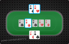 Держат A♠️ K♣️ на префлопе. Рейзят до 3 больших блайндов. Флоп — K♦️ 10♣️ 5♠️. Ставят половину банка, соперник сбрасывает. Победа без вскрытия.