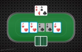 Допустим, пара девяток на руках. Флоп — король, дама, десятка. Лучше пропустить или сбросить при ставке. Тактика игры в покер с такими картами требует терпения.